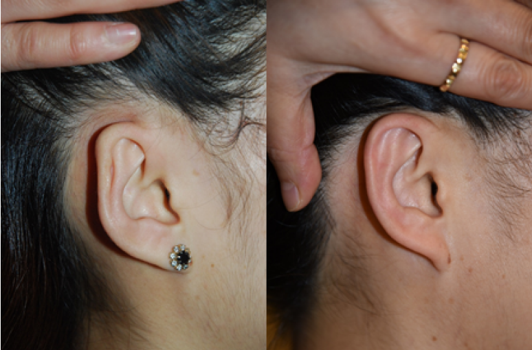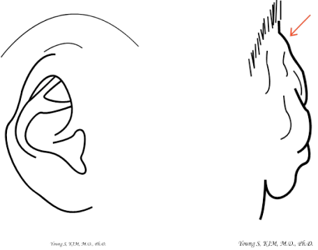 또한 많은 경우에 오랫동안 귀가 파묻혀 있어서 귀 상부에 이차적인 변형이 동반되기도 합니다 (상부연골유착변형).