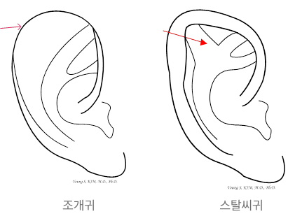 정상적으로 귀는 머리 쪽에서 약 2.0cm정도 떨어지도록 돌출되어 있는데 선천적 혹은 후천적(대부분 귀의 수술적 치료로 생기는 경우)으로 너무 머리 쪽으로 붙어 있는 경우가 있습니다. 선천적으로는 이륜의 부족으로 정면에서 보면 귓바퀴가 보이지 않는 부분이 있고 상대적으로 대이륜이 돌출되어 보이게 되어 누워있다고 표현하게 됩니다. 후천적으로는 대부분 수술적 치료후에 생기는 것으로 돌출귀수술을 하고나서 너무 과하게 머리 쪽으로 붙은 예를 흔히 볼수 있습니다. 귀가 너무 돌출되어 있는 것도 문제이지만 귀가 너무 눕게 되면 얼굴전체의 조화가 깨지게 됩니다. 교정은 귀를 상,중,하로 나누었을 때 어떤 부분을 교정해야 할지를 결정해야 합니다. 모든 구조가 잘 만들어져 있는데 누워있을 때는 귀전체가 머리 쪽에서 자연스럽게 떨어지도록 하는 수술법을 쓰며 대이륜(귀안의 y자 주름)이 유난히 돌출이 되어 누운 경우에는 대이륜의 주름을 완화하는 교정법을 사용합니다.