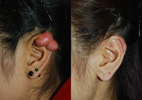 켈로이드란 상처의 치유과정 중에 비정상적으로 섬유조직이 과도하게 성장하여 생기는 변형으로 체질적 요인이 있으며 일반적으로 피부 여유가 없는 앞가슴, 어깨 등 같은 곳에 잘 생기는 경향이 있지만 귀 또한 잘 생기는 부위 중 한 곳입니다. 귀에 생기는 켈로이드는 대부분 피어싱으로 인해 생기는 경우가 많은데 귀걸이를 하고 진물이 나오는데도 계속 피어싱을 함으로써 과도하게 섬유 조직이 자라서 가려움, 통증뿐 아니라 미용적인 문제를 일으킵니다. 그래서 피어싱 초기에 진물이 나는 등 염증 증상이 있을 때는 피어싱을 중단하고 초기에 치료하는 것이 중요합니다. 켈로이드의 치료는 주사요법, 압박요법, 방사선요법등 여러 가지 치료법이 있지만 그만큼 확실한 치료법이 없다고 할 수 있습니다. 대부분 간편하게 주사요법을 시도해보지만 재발하는 경우가 많고 사이즈가 크다면 결국 수술적 요법을 시행해야 하는데 문제는 재발입니다. 아직까지 재발이 없다 하는 방법은 없으며 수술 후에 흉터를 덜 생기게 하는 약 복용, 압박요법등 복합적인 방법을 사용하여 재발이 적도록 하는 것이 최선입니다. 특히 재발한 켈로이드 교정은 신중하게 시행되어야 하며 수술 후 국소적으로 방사선 치료를 하는 것이 재발을 최소로 한다고 알려져 있습니다. 무엇보다 귀에 생기는 켈로이드의 수술적 교정 시 중요한 것은 귀의 모양을 보존하고 복원하는 것입니다.
